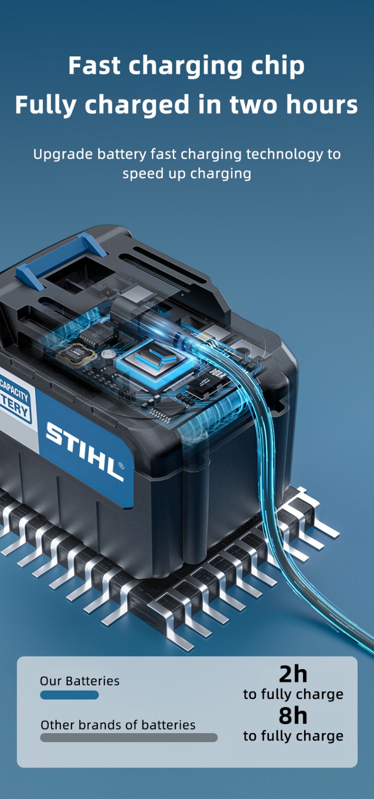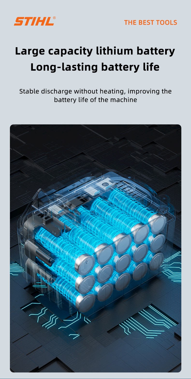 Visokokapacitetna litijeva baterija od 96 V i 16 Ah može se kontinuirano koristiti 48 sati nakon 2 sata punjenja, što vam omogućuje cjelodnevni rad bez brige o tome da ćete ostati bez energije.